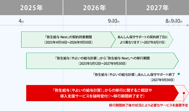 弥生株式会社で発表されている移行全体スケジュールに合わせ、弊社では移行に関するご相談や導入支援サービスのお申し込みを随時受け付けております。